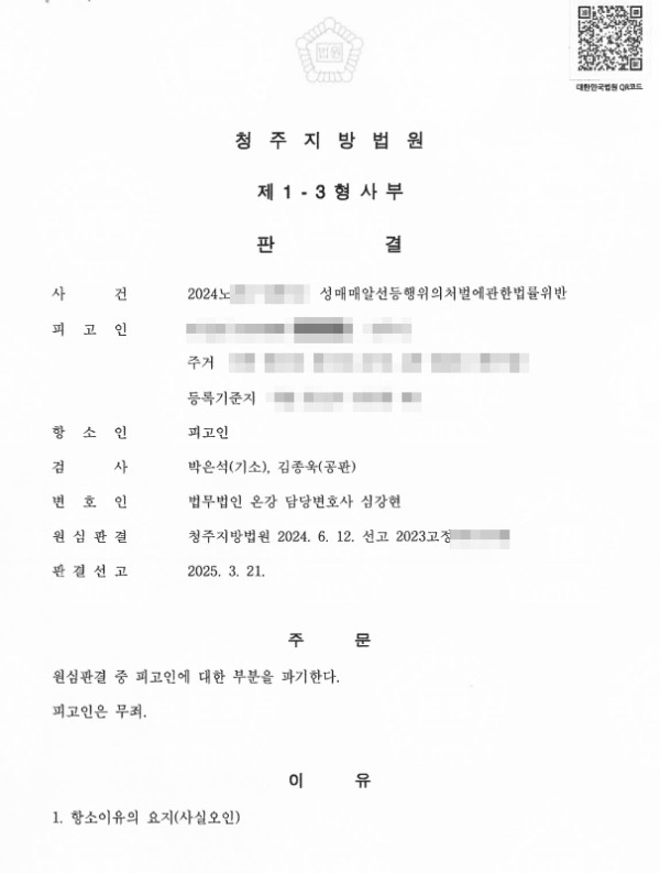 심강현 변호사는 의뢰인이 성매매를 하지 않은 근거와 관련된 정황증거들을 충실히 수집하였고, 법정에서 마사지사를 증인으로 소환하여 장부 및 성매수 남성과 관련된 마사지사의 기존 경찰 진술의 모순점과 불확실성에 대해서 효과적으로 변론을 하였습니다.