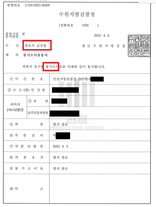 검사는 변호인의 주장을 모두 받아들이고 불기소결정(혐의없음)을 하였습니다.