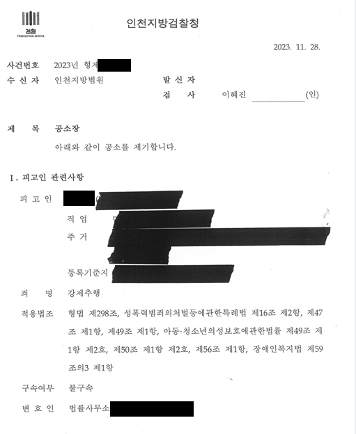 가해자가 혐의를 극구 부인하였으나, 검사는 가해자의 혐의를 인정하여 구공판(정신재판 청구) 처분을 하였고, 현재 1심 재판이 진행 중입니다.