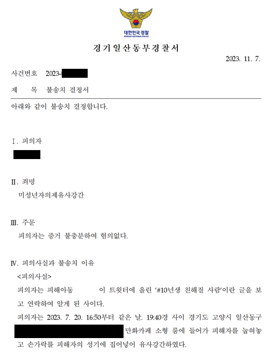 아동청소년 유사강간 학폭 사건, 혐의없음