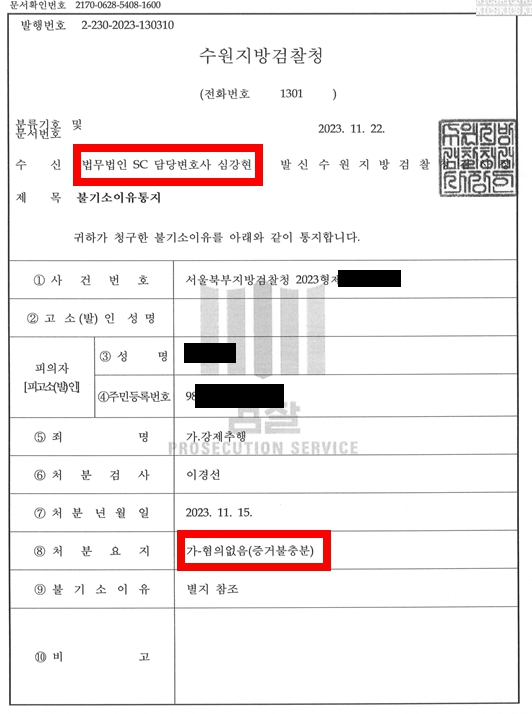 수사가 장기화되었으나, 수사검사는 결국 피의자의 신빙성이 더 높게 인정된다는 이유로 의뢰인에게 혐의없음 불기소 처분을 하였습니다.
