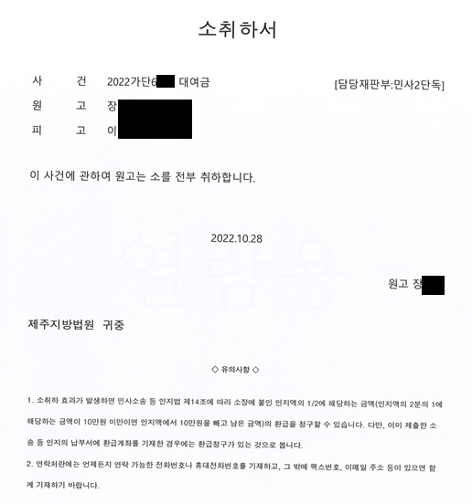 결국 원고는 승소가능성이 없다고 판단하고 스스로 소취하를 하였습니다.