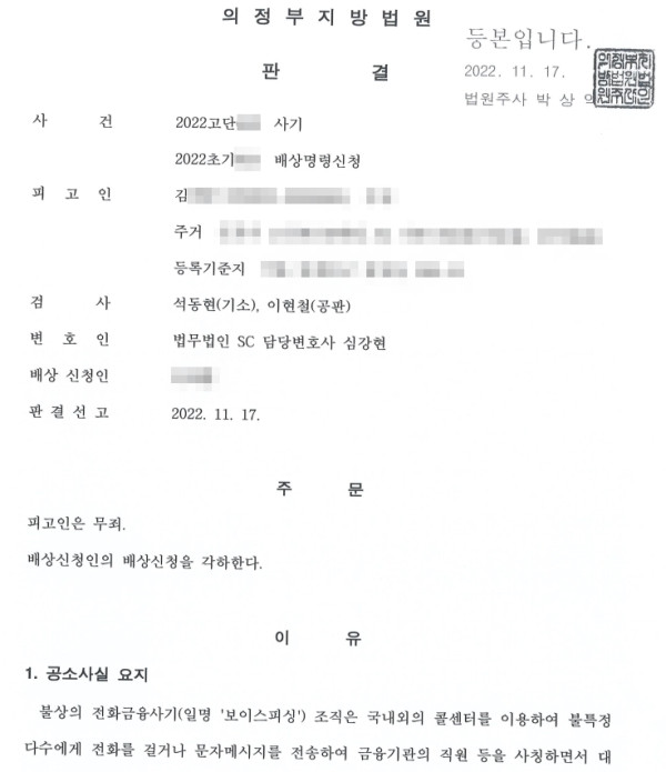 보이스피싱 현금전달책, 재판 중 구속취소 및 1심 무죄