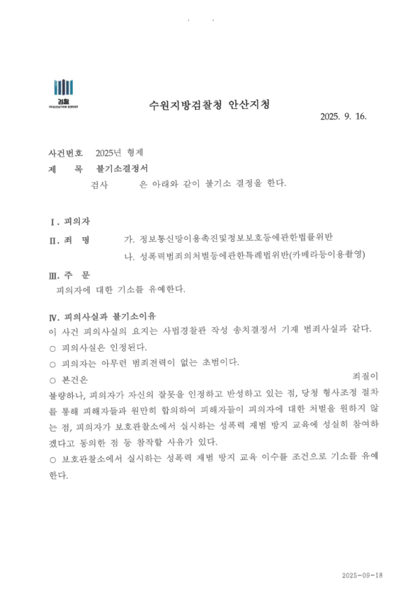 성관계 영상 등 불법촬영 사건, 기소유예 처분